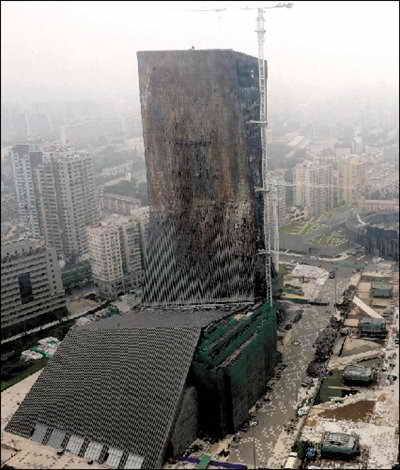 央視過火樓被燒毀墻面將被拆卸。本報(bào)記者 張沫 攝