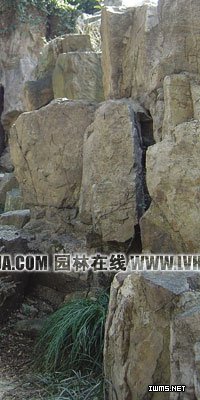 挑與壓 一般用具有橫向紋理的山石作橫向挑出,以造成飛舞之勢,所以又稱“出挑”。“單挑”為一石挑出,“重挑”為挑石下有一石承托。如果要逐層挑出,出挑的長度最好以挑石的1/3為宜。挑石一定要選用一些質地堅固而無暗斷裂痕的山石,其判別的方法,一般以輕敲聽聲來鑒別。如果是兩端都挑出,則對挑石的選用更需細心。現蘇州假山匠師也有采用豎石作出挑的,但難度較高。“挑”的關鍵是“巧安后堅”,“前懸渾厚,后堅藏隱”,所以它和“壓”具有不可分割的關系。“偏重則壓”,即橫挑而出的造型山石會造成重心外移,偏于一側,這時就必須要用山石來進行配壓,使其重心穩定,所以壓石尤以能達到堅固而渾然一體最為重要。一般一組假山或一組峰巒,最后的整體穩定是靠收頂山石的配壓來完成的,此時則需要選用一些體量相對較大、造型較好的結頂石來配壓收頂,這樣會顯得既穩固又美觀。 飄 挑頭置石為“飄”。飄石的使用主要是豐富挑頭的變化。飄石的選用,其紋理、石質、石色等應與挑石相一致或協調。在傳統上,有時還可將飄石處理成各種的動物形象;而在現代疊石技法上,在傳統的“飄”的疊法基礎上,又有了新的突破和發展,它常選用一些體量較小、具有狹長、細彎、輕薄等特征的山石,按照造型構思,利用黏結材料以及捆、綁、卡、夾、支、撐、掛等方法,進行定位、定形,從而創作出一種石與石之間,具有留空、留白特點的鑲石或搭接技術,通過“飄”的處理,能使假山的山體外形輪廓顯得輕巧、空透、飄逸。它多用于太湖石假山類型中的小品堆疊。 疊 “巖橫為疊”,即用橫石進行拼疊和壓疊,以形成橫向巖層的結構的一種疊石技法,這是傳統假山堆疊中最常用的方法。如網師園“云岡”黃石假山的造型,就是運用了以“巖橫為疊”的主要手法而構成的。但在具體堆疊中,必須留意石與石之間的紋理相一致, 豎 是指石壁、石洞、石峰等所用的直立之石的一種疊石技法。用豎石進行豎疊,因所承受的重量較大,而受壓面又較小,所以必須要做好剎墊,讓它的底部平穩,不失重心,并拼接牢固。黃石假山的風格有橫疊和豎疊之分,如耦園黃石假山中的懸崖和矗峰就是用豎疊這種豎向的巖層結構進行施工造型的。在豎疊時,應注意拼接的咬合無隙,有時則需多留些自然縫隙,不作滿鑲密縫,以減少人工痕跡。 墊 處理橫向層狀結構時所用的剎石。在向外挑出的大石下面,為了結構穩妥和外觀自然,形成實中帶虛的效果,特墊以石塊。此外,在假山施工過程中,都必須注意用剎片進行墊實,只有這樣,才能使山石穩定牢固。古代假山的堆疊,向來以干砌法為主,即在不抹以膠結材料(如灰漿等)的前提下,使構成假山的山石重心穩定、結構牢固。所以說,疊山墊石最為關鍵。而膠結材料除了增加假山的整體強度外,還具有修飾山石間的拼接,使其天衣無縫,渾然一體,并有自然巖體的風化趣味的作用。墊足墊穩,不但可省膠結材料,而且堅固勝之。 鉤 即山石在橫平伸出過多的情況下,在挑出的造型山石的端部,放置一塊具有轉折形態和質感的小型山石,或向下作懸鉤,以改變橫向造型的呆滯。“鉤”也是“金華幫”傳統的疊石方法,它主要用山石和輔助鐵件進行石與石之間的鉤接收頭,或對以條石為框架的假山山體的包貼。 撐 也稱“戧”,即用斜撐的支力來穩固山石的一種做法。山石偏斜、懸挑、發拱、收頂等均要用撐。撐石必須選擇合理的支撐力點,外觀還應與山體的脈絡相連貫,以渾為一體。撐因與黃石假山的橫平豎直的巖層節理不甚相符,所以不相適用,它常用于太湖石假山中,但也僅作為一些特殊置石的輔助加工和修飾,而且一般其用石也較小。 以上所列的南北疊石字訣,只是古代疊山匠師在假山造型施工中的一些典型手法,這些造型手法在實際施工中應靈活運用,切不可拘泥形式,刻意去追求。