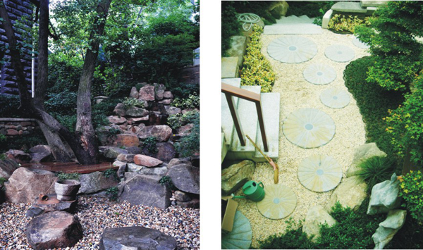 2.庭院構思與立意 在現代住區規劃的組團綠地布局中,局部營造出新古典風格的庭院,雖有先例,但無常規。特別是空間層次的組織及使用功能都不相同,不能生搬傳統造園的手法,只能因地制宜的利用現狀條件,從空間尺度上準確的把握比例。反復調整空間組合、植物配置、小品細部設計。即有傳統風格“移步景異”的美妙感受,又具備現代生活所需的功能性。 2.1相地與布局 業主對傳統文化的喜愛和體驗,為此設計中充分強調了庭院風水的重要性。 在構成庭院風水的元素中,水是最重要的環節之一。無論是滋養生命、提升活力,還是招引財氣、啟迪智慧,水的作用都是不可替代的。《黃帝宅經》指出,宅以泉水為血脈。因此,完美的庭院里都必須有水體畫龍點睛。