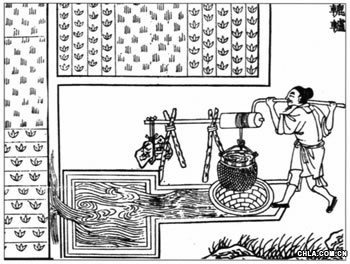 用轆轤可以取用較深的地下水灌溉。由于井水水溫較低,不適于作物生長(zhǎng),因此還要經(jīng)過(guò)蓄水池的晾曬以提高水溫后,才由渠道進(jìn)入農(nóng)田。