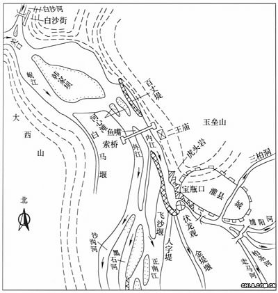 都江堰位于岷江上游成都的西北。這里是岷江進(jìn)入成都平原的起點(diǎn),在地形上具有自流引水的良好條件。要實(shí)現(xiàn)引岷江水進(jìn)入成都,首先需開(kāi)鑿引水口,寶瓶口是利用岷山山脈余端鑿開(kāi)的永久性進(jìn)水口,是都江堰最早興建的關(guān)鍵性工程。寶瓶口開(kāi)鑿成功為都江堰的發(fā)展開(kāi)創(chuàng)了廣闊的前景。都江堰經(jīng)歷了不斷完善和發(fā)展的過(guò)程,至遲在唐代渠首即具備了現(xiàn)在的規(guī)模,形成了由分水工程——魚(yú)嘴、導(dǎo)流工程——百丈堤和人字堤、調(diào)節(jié)工程——飛沙堰、進(jìn)水口——寶瓶口組成的樞紐工程。魚(yú)嘴建在岷江江心洲的頂端,江水在此一分為二,左側(cè)水流稱(chēng)內(nèi)江,水流經(jīng)百丈堤、人字堤、飛沙堰、寶瓶口的綜合調(diào)節(jié),余水通過(guò)飛沙堰匯入岷江。渠首各工程組成有機(jī)的整體。科學(xué)的布置和合理的高程控制使都江堰排放相宜,運(yùn)行至今,效益不減。