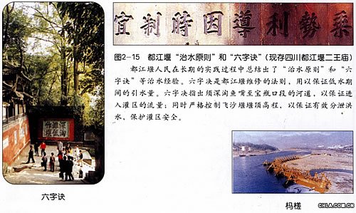 都江堰的建筑材料全部就地取材。岷江中的卵石、山區(qū)的都是都江堰運(yùn)用2000多年的主要建筑材料。都江堰所有的工程都由這三種材料修筑:用竹子編成竹籠,或綁扎成榪杈。以卵石充填而成的竹籠堤,以榪杈為骨架的土石堤,可以修筑各類(lèi)水工設(shè)施。中國(guó)傳統(tǒng)的水工構(gòu)件、施工工藝幾乎都可以在都江堰找到影子。都江堰依靠完善的管理得以維系,工程歲修從公元前3 世紀(jì)就成為定例,每年都要投入數(shù)千人甚至上萬(wàn)人疏浚河渠,修筑堤堰。人們又總結(jié)出“深淘灘,低作堰”的疏浚河渠的技術(shù)準(zhǔn)則。秦代主管水利的官員在都江堰設(shè)置石人,規(guī)定寶瓶口水位最高不超過(guò)石人肩,最低不超過(guò)石人足,這是中國(guó)最早設(shè)置的水位站,即通過(guò)水位控制引水量的水利工程。幾千年的灌溉滋養(yǎng),使得當(dāng)?shù)厝藗冃纬闪艘云鋭?chuàng)建者李冰為偶像的水的宗教崇拜,官方的祭祀則成為灌區(qū)干渠的官方管理與田間小渠的民間管理之間溝通和協(xié)調(diào)的紐帶。