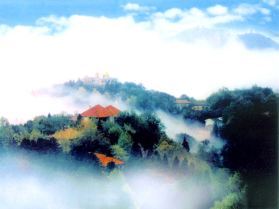 雞公山之所以兩度榮登“中國十大避暑名山”榜,得益于其豐富的自然資源和厚重的人文內涵。一是擁有獨特的自然景觀。雞公山位于信陽市南38公里的豫鄂交界處,素有“青分楚豫”之稱。處于冷暖空氣交綏區,兩側峽谷深平,易于通風,似兩條通風走廊,一年四季,時有風生風息,故有“無日不風”之說。特別是夏季,清風送爽,驅熱消炎。加之處于南北動植物過渡帶,山上植被豐茂,覆蓋率高達87%,有各類植物2200多種。由于受地形、植被、風、雨的交叉影響,雞公山形成了自己獨特的小氣候,其氣候特點是:冬長夏短,春秋相當,夏季氣候涼爽宜人,平均氣溫23.7度,最高氣溫32度。三伏盛夏,午前為春,午后如秋,夜如秋冬,有“三伏炎蒸人欲死、清涼到此頓疑仙”之美譽。雞公山雖有高山氣候,卻無高山反應,特別適宜療養避暑。山上風光秀麗,“佛光、云海、霧淞、雨淞、霞光、異國花草、奇峰怪石、瀑布流泉”是雞公山獨特的八大自然景觀。