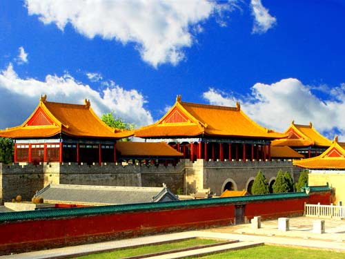 西岳廟的山門稱為“灝靈門”,它和五門樓同為高大的磚石建筑,形制與北京故宮的端門頗相類似,為明代遺物。在五門樓之后,是清代改建的欞星門,枋檀上的彩畫保持著明代早期式樣。從這里進去,便是綠林掩映中的正殿“灝靈殿”,是琉璃瓦單檐歇山頂式建筑,面寬七間,進深五間,周有回廊,殿基高大、宏偉,整座宮殿全部坐落在一個大月臺上。月臺平面為一“凸”字形,周圍用石條砌成,顯得氣勢巍然。殿內懸掛有清代康熙、道光等題的“金光昭瑞”、“仙掌凌云”等匾額。