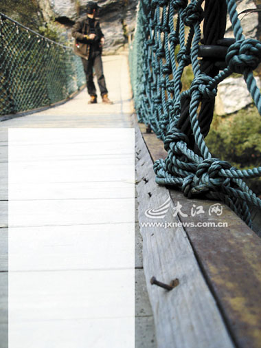 走在龍珠峰附近的吊橋上,記者看到吊橋邊緣一些固定木板的木條已卷起或脫落,許多木板中的鐵釘已松動甚至被拔起。在烏龍潭附近一附著山崖而建的吊橋,木橋板被用幾根細鋼絲簡單環扎后固定住,面臨峽谷的乳白色網繩,顯然剛換不久,卻比先前使用的墨綠色老網繩要細小許多。
