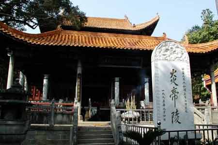 炎帝陵又稱“天子墳”,位于湖南省株洲市炎陵縣縣城西南15公里處的炎陵山山麓。相傳上古時代,中華民族的始祖炎帝神農氏來南方巡視,嘗采藥,為民治病,不幸誤嘗毒草身亡,安葬于此。炎帝是一位偉大人物,他開發了華夏的原始農業,是農耕文化的創始人;他創造制耒耜,教民耕種,提高農作物的產量;他遍嘗百草,為人醫病,是華夏中草藥的第一位發現者和利用者;他還利用火為人類造福,制造樂器,倡導物質交換。炎帝在歷史傳說中是與農、工、商、醫、文等各領域的發明創造分不開的一位神祉,因而一直受到歷朝歷代的炎黃子孫的無比敬仰和祭祀。