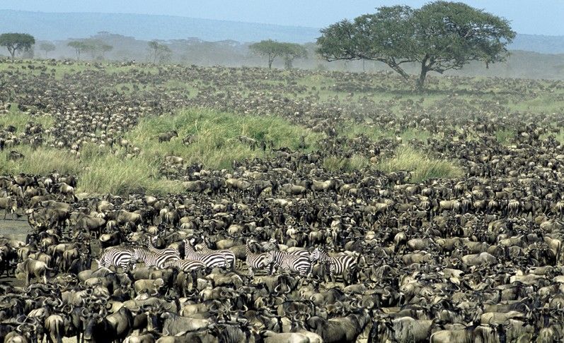 肯尼亞馬塞馬拉?夏醽喌鸟R塞馬拉稀樹原和坦桑尼亞的塞倫蓋蒂維持著世界草食動物最大規(guī)模的遷移。每年七月,130萬只角馬,以及大群斑馬和瞪羚由塞倫蓋蒂平原向北遷移至馬塞馬拉牧場。降雨模式的改變威脅著該地區(qū)脆弱的生態(tài)系統(tǒng)。