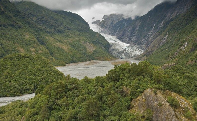 新西蘭,約瑟夫冰川。約瑟夫冰川被公認為是新西蘭西部海岸上的一顆明珠。它位于溫度適宜的熱帶雨林區,海拔從11,500到790英尺不等,山上的冰川融水直接注入外后(WaiHou)河。但是它從2000年水量開始變得越來越小,專家預測下個世紀它將完全消失在人們的視野。