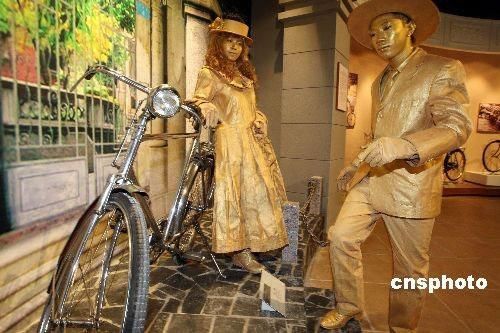 行為藝術者在河北省霸州市新落成的華夏民間收藏館自行車博物館內表演,表演者倚靠的是1910年英國生產的白金牌自行車。